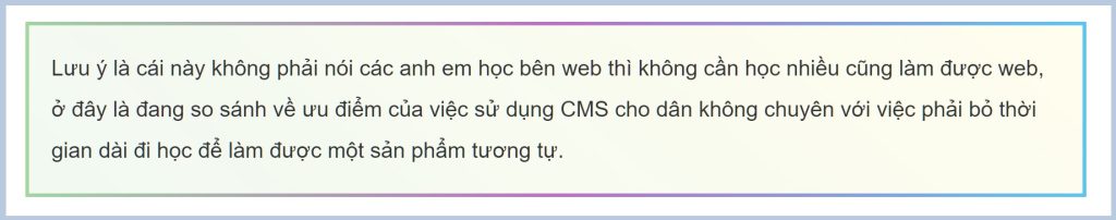 Lưu ý là cái này không phải nói các anh em học bên web thì không cần học nhiều cũng làm được web, ở đây là đang so sánh về ưu điểm của việc sử dụng CMS cho dân không chuyên với việc phải bỏ thời gian dài đi học để làm được một sản phẩm tương tự.</div>